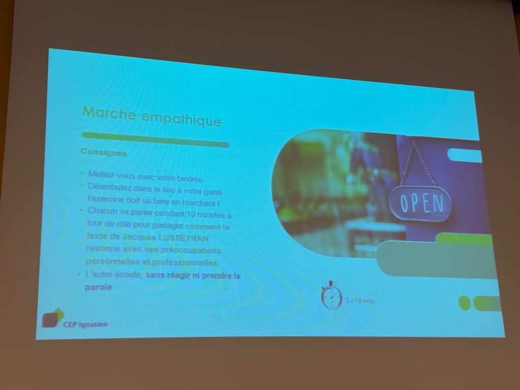 Ces rappels utiles étant faits, le P. Pascal Sevez du CEPI, nous a tous mis en route avec un extrait d’une intervention de Mgr Aveline autour du thème du service et de la collaboration, mis en lien avec l’abandon à la Providence, cet « Amour qui nous regarde ». Le chemin s’est poursuivi avec une promenade empathique : après un temps de lecture individuelle d’extraits de « Et la lumière fut » de Jacques Lusseyran, les participants ont arpenté, deux par deux, les allées et le parc de la Maison Saint-Michel. Cet exercice mutuel d’écoute active et de prise de parole, ce compagnonnage, a été une belle introduction au travail de l’après-midi autour des axes du projet, sous la forme d’une conversation spirituelle.
